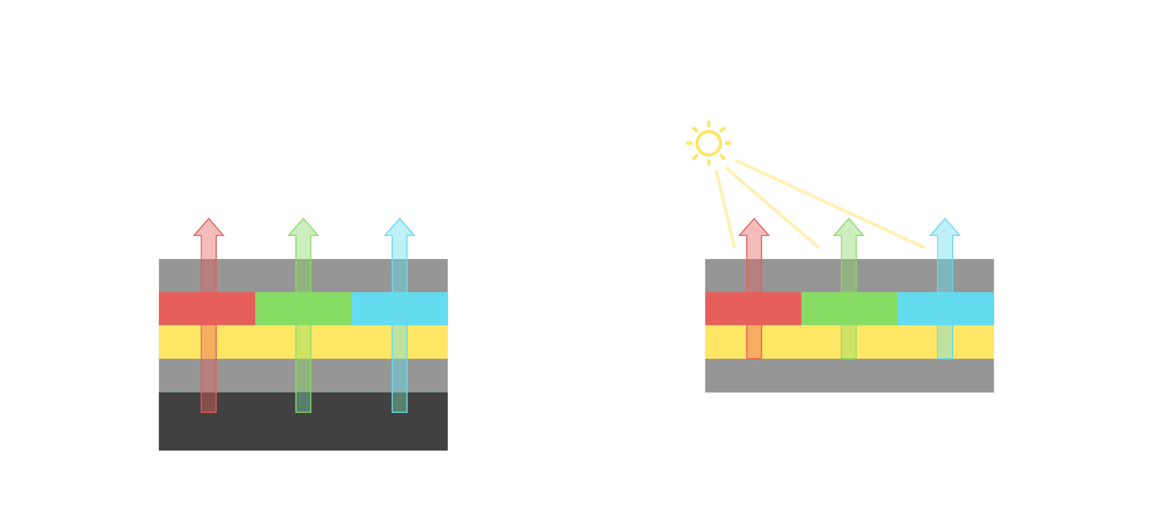 与传统需搭配背光单元的液晶显示相比,,,反射式液晶技术不仅更省电、、、、更轻薄,,且即便在艳阳下仍能清晰显示。。此外,,少了背光单元,,也大幅降低了 LED 蓝光伤害眼睛的疑虑。。。。