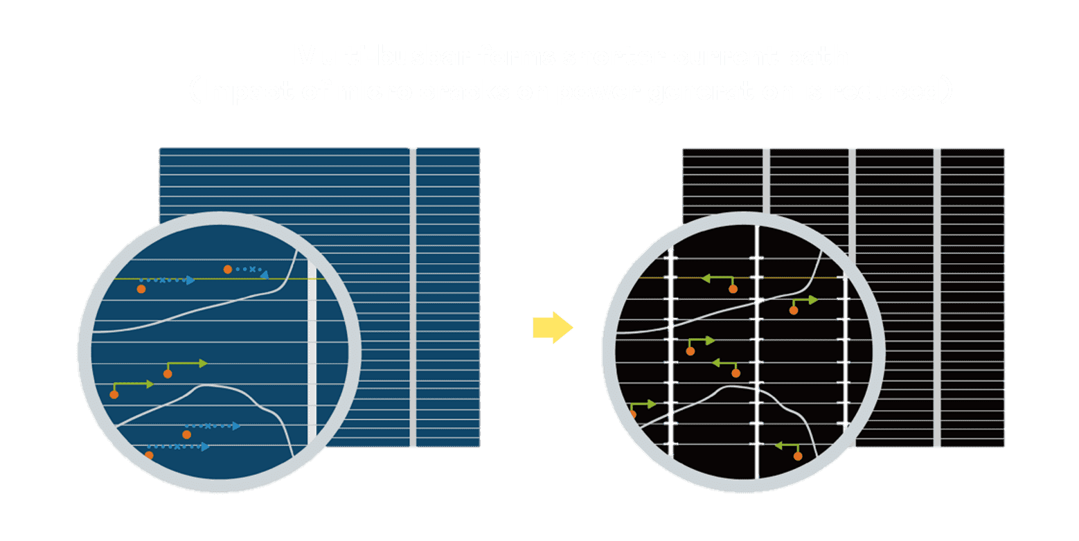 • 电池使用多条铜导线 (Copper wire) 于电池片上形成较短的电流路径,,,提高电流收集效率,,,,采用圆形设计的铜导线较传统扁平式的铜焊带 (Ribbon),,可增加入射至电池的光线量。。。。