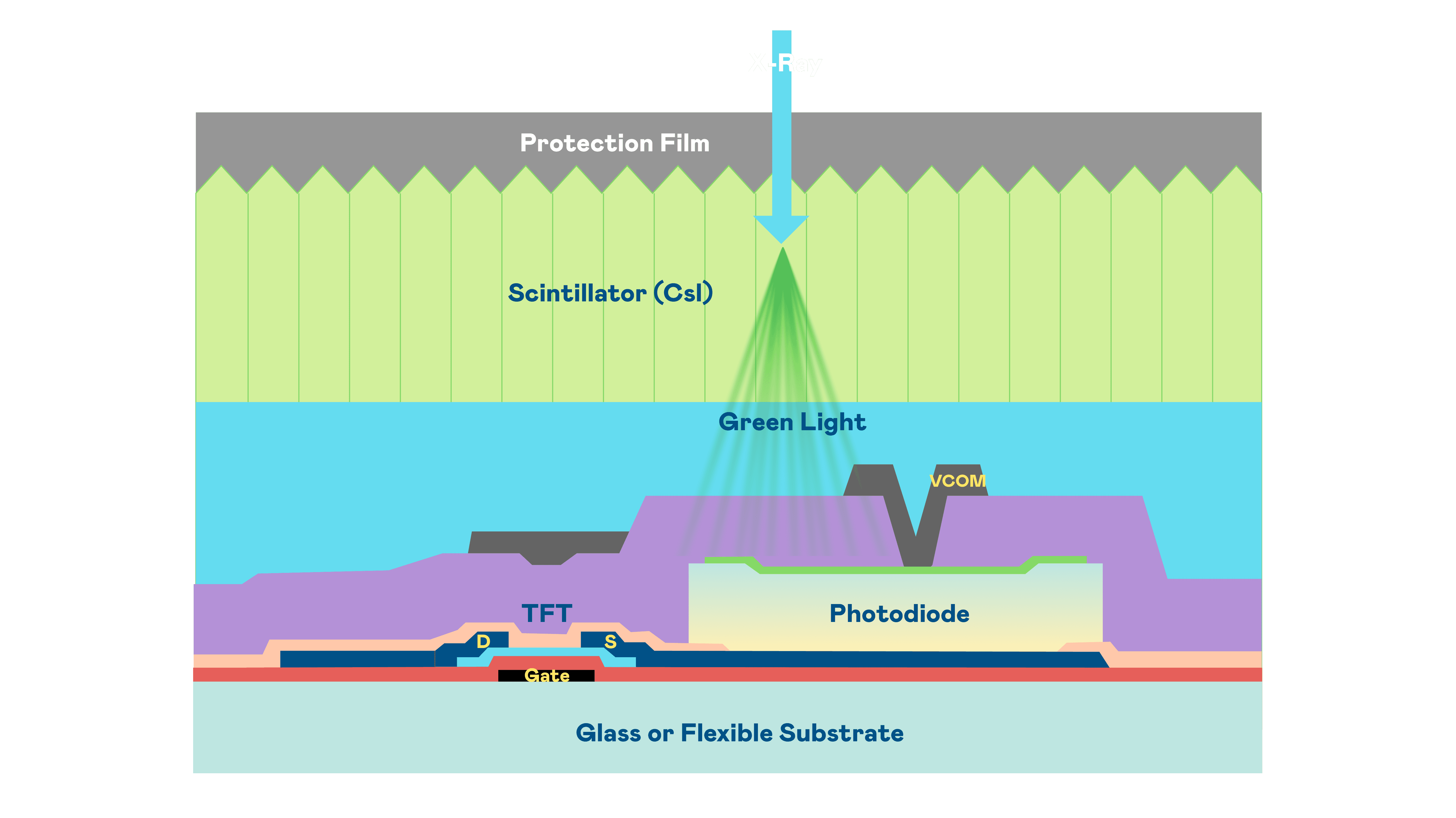 EBpay的X光影像感测阵列使用薄膜电晶体 (TFT) 作为每个像素的读取开关,,,,搭配光电二极体(Photodiode)的光电转换元件,,,用以感测X光影像讯号。。。。